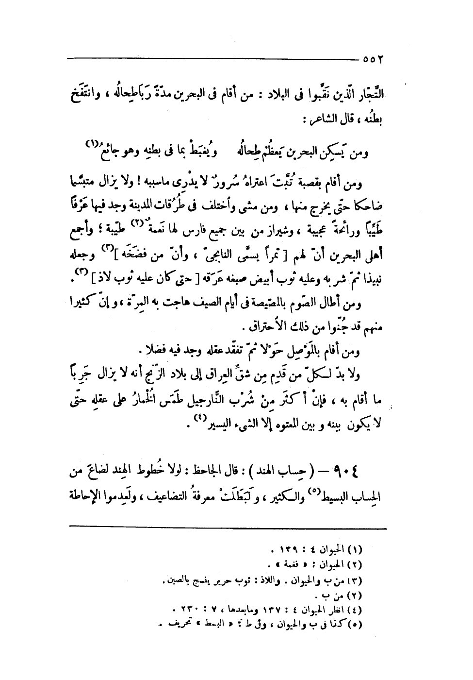 904 - (حِسَاب الْهِنْد) قَالَ الجاحظ لَوْلَا خطوط الْهِنْد لضاع من الْحساب الْبَسِيط وَالْكثير ولبطلت معرفَة التضاعيف ولعدموا الْإِحَاطَة