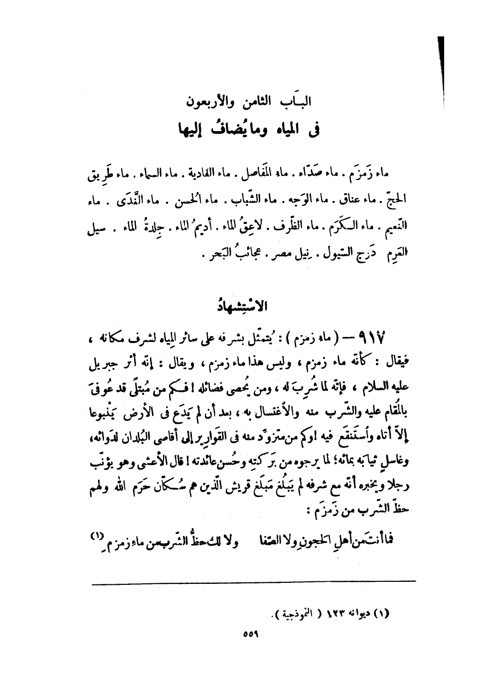 917 - (مَاء زَمْزَم) يتَمَثَّل بشرفه على سَائِر الْمِيَاه لشرف مَكَانَهُ فَيُقَال كَأَنَّهُ مَاء زَمْزَم وَلَيْسَ هَذَا مَاء زَمْزَم وَيُقَال إِنَّه أثر جِبْرِيل عَلَيْهِ السَّلَام فَإِنَّهُ لما شرب لَهُ وَمن يُحْصى فضائله فكم من مبتلى قد عوفى بالْمقَام عَلَيْهِ وَالشرب مِنْهُ والاغتسال بِهِ بعد أَن لم يدع فى الأَرْض ينبوعا إِلَّا أَتَاهُ واستنقع فِيهِ وَكم من متزود مِنْهُ فى الْقَوَارِير إِلَى أقاصى الْبلدَانِ لدوائه وغاسل ثِيَابه بمائه لما يرجوه من بركته وَحسن عائدته قَالَ الْأَعْشَى وَهُوَ يؤنب رجلا ويخبره أَنه مَعَ شرفه لم يبلغ مبلغ قُرَيْش الَّذين هم سكان حرم الله وَلَهُم حَظّ الشّرْب من زَمْزَم