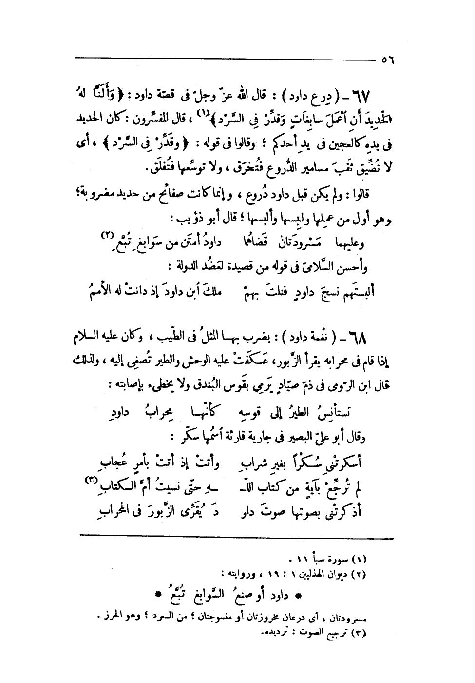 68 - (نَغمَة دَاوُد) يضْرب بهَا الْمثل فِي الطّيب وَكَانَ عَلَيْهِ السَّلَام إِذا قَامَ فِي محرابه يقْرَأ الزبُور عكفت عَلَيْهِ الْوَحْش وَالطير تصغى إِلَيْهِ وَلذَلِك قَالَ ابْن الرومى فِي ذمّ صياد يَرْمِي بقوس البندق وَلَا يخطىء بإصابته
