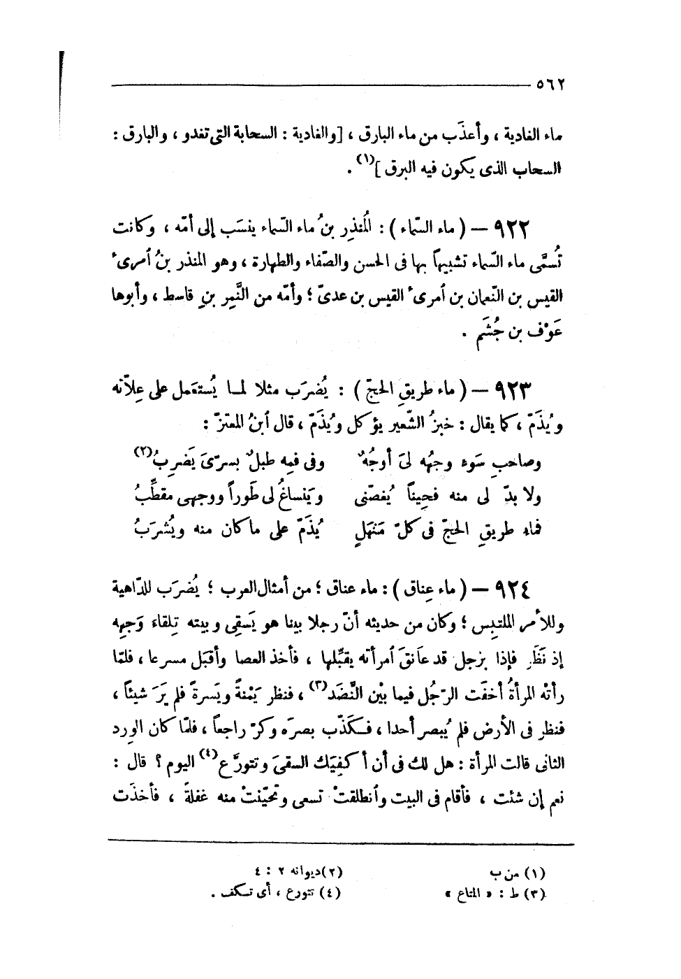923 - (مَاء طَرِيق الْحَج) يضْرب مثلا لما يسْتَعْمل على علاته ويذم كَمَا يُقَال خبز الشّعير يُؤْكَل ويذم قَالَ ابْن المعتز