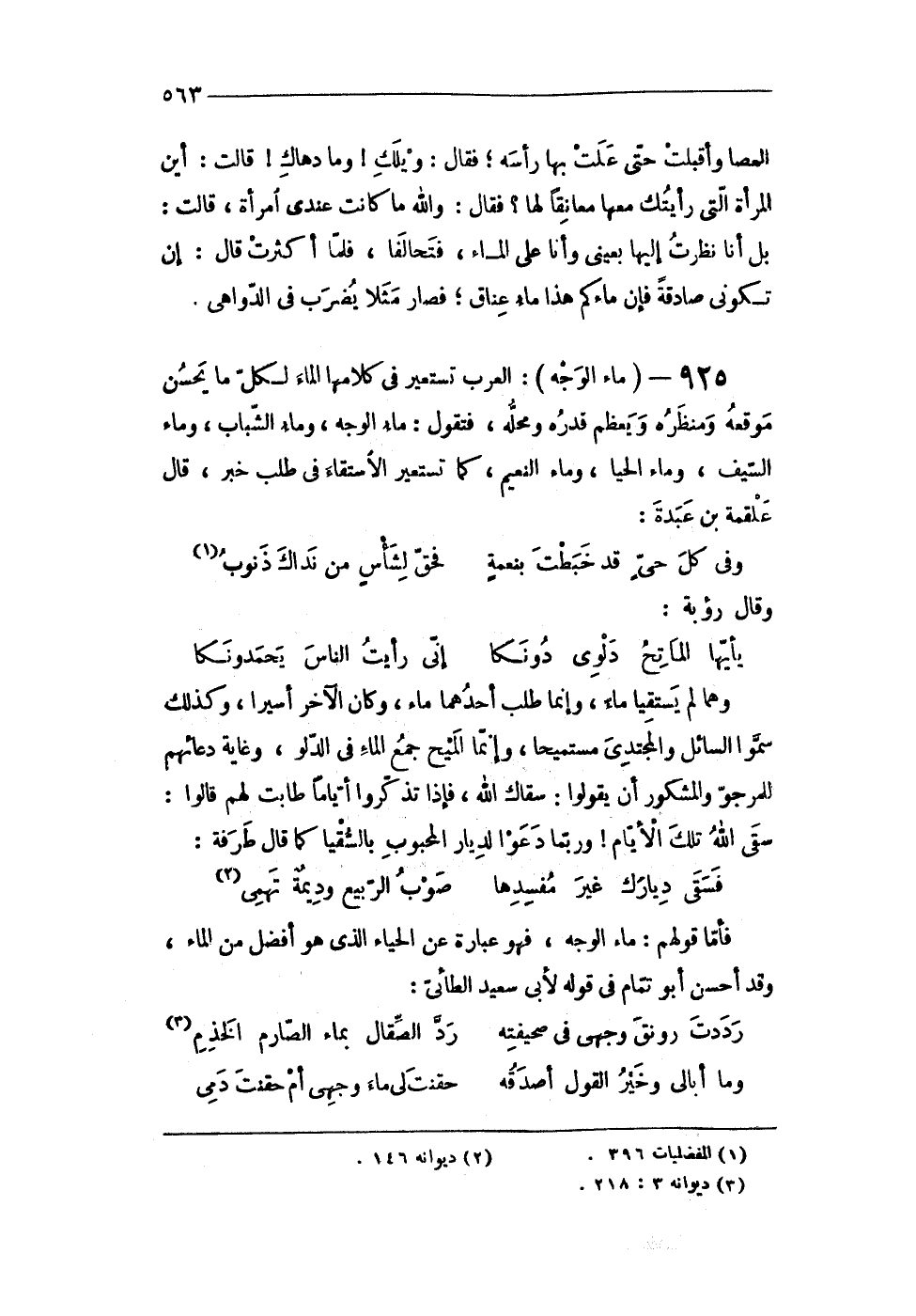 925 - (مَاء الْوَجْه) الْعَرَب تستعير فى كَلَامهَا المَاء لكل مَا يحسن موقعه ومنظره ويعظم قدره وَمحله فَتَقول مَاء الْوَجْه وَمَاء الشَّبَاب وَمَاء السَّيْف وَمَاء الحيا وَمَاء النَّعيم كَمَا تستعير الاستقاء فى طلب خبر قَالَ عَلْقَمَة بن عَبدة