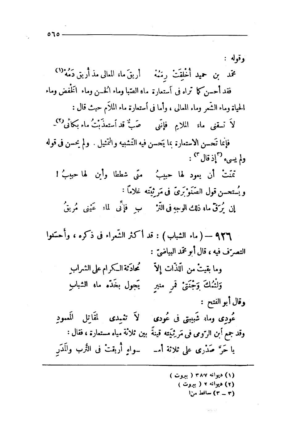 926 - (مَاء الشَّبَاب) قد أَكثر الشُّعَرَاء فى ذكره وأحسنوا التَّصَرُّف فِيهِ قَالَ أَبُو مُحَمَّد البياضي