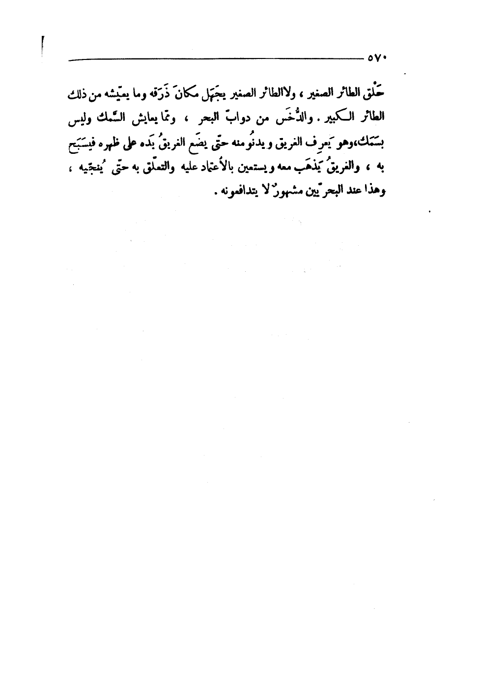 حلق الطَّائِر الصَّغِير وَلَا الطَّائِر الصَّغِير يجهل مَكَان ذرقه وَمَا يعيشه من ذَلِك الطَّائِر الْكَبِير والدخس من دَوَاب الْبَحْر وَمِمَّا يعايش السّمك وَلَيْسَ بسمك وَهُوَ يعرف الغريق وَيَدْنُو مِنْهُ حَتَّى يضع الغريق يَده على ظَهره فيسبح بِهِ والغريق يذهب مَعَه ويستعين بالاعتماد عَلَيْهِ والتعلق بِهِ حَتَّى ينجيه وَهَذَا عِنْد البحريين مَشْهُور لَا يتدافعونه
