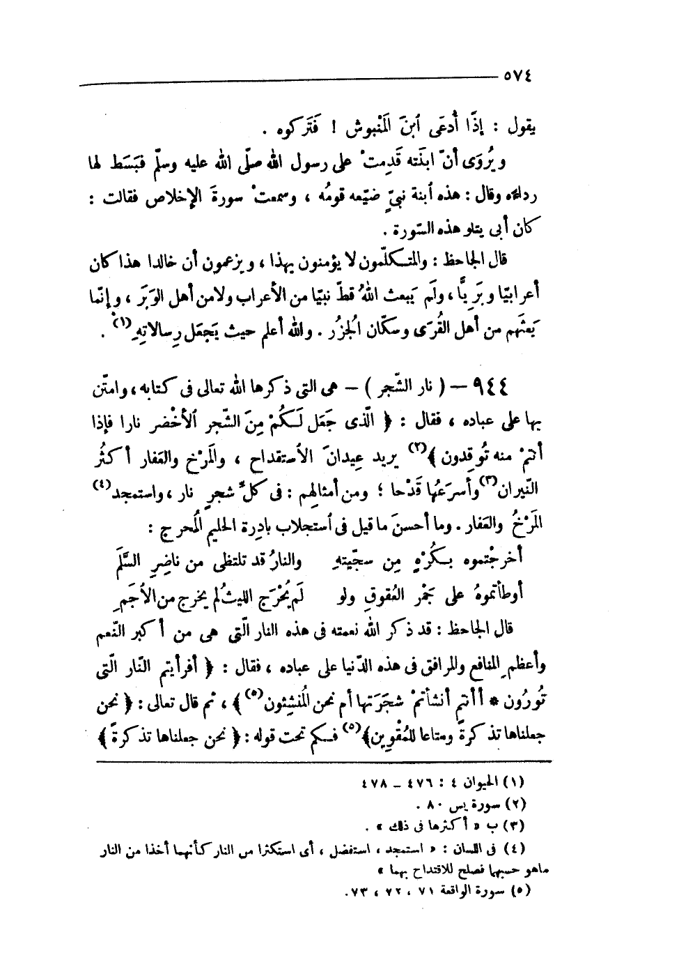 قَالَ الجاحظ قد ذكر الله تَعَالَى نعْمَته فى هَذِه النَّار الَّتِى هى من أكبر النعم وَأعظم الْمَنَافِع والمرافق فى هَذِه الدُّنْيَا على عباده فَقَالَ {أَفَرَأَيْتُم النَّار الَّتِي تورون أأنتم أنشأتم شجرتها أم نَحن المنشئون} ثمَّ قَالَ تَعَالَى {نَحن جعلناها تذكرة ومتاعا للمقوين} فكم تَحت قَوْله {نَحن جعلناها تذكرة}