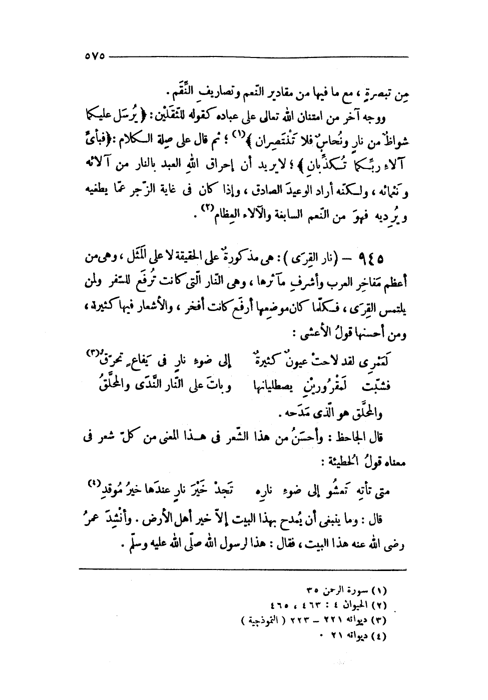 945 - (نَار الْقرى) هى مَذْكُورَة على الْحَقِيقَة لَا على الْمثل وهى من أعظم مفاخر الْعَرَب وأشرف مآثرها وهى النَّار الَّتِى كَانَت ترفع للسَّفر وَلمن يلْتَمس الْقرى فَكلما كَانَ موضعهَا أرفع كَانَت أَفْخَر والأشعار فِيهَا كثيرا وَمن أحْسنهَا قَول الْأَعْشَى