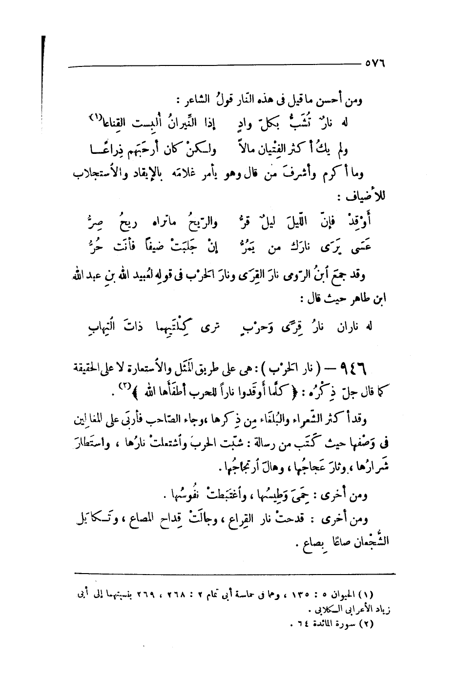 وَقد جمع ابْن الرومى نَار الْقرى ونار الْحَرْب فى قَوْله لِعبيد الله بن عبد الله ابْن طَاهِر حَيْثُ قَالَ