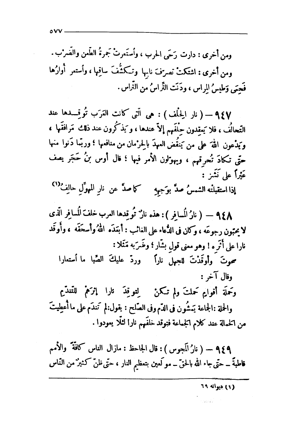 947 - (نَار الْحلف) هى الَّتِى كَانَت الْعَرَب توقدها عِنْد التَّحَالُف فَلَا يعقدون حلفهم إِلَّا عِنْدهَا ويذكرون عِنْد ذَلِك مرافقها وَيدعونَ الله على من ينْقض الْعَهْد بالحرمان من مَنَافِعهَا وَرُبمَا دنو مِنْهَا حَتَّى تكَاد تحرقهم ويهولون الْأَمر فِيهَا قَالَ أَوْس بن حجر يصف عيرًا على نشز