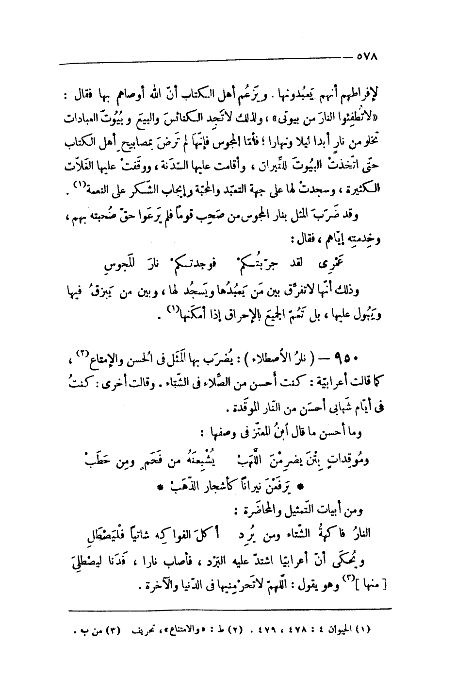 لإفراطهم أَنهم يعبدونها وَيَزْعُم أهل الْكتاب أَن الله أوصاهم بهَا فَقَالَ {لَا تطفئوا النَّار من بيوتى} وَلذَلِك لَا تَجِد الْكَنَائِس وَالْبيع وبيوت الْعِبَادَات تَخْلُو من نَار أبدا لَيْلًا وَنَهَارًا فَأَما الْمَجُوس فَإِنَّهَا لم ترض بمصابيح أهل الْكتاب حَتَّى اتَّخذت الْبيُوت للنيران وأقامت عَلَيْهَا السَّدَنَة ووقفت عَلَيْهَا الغلات الْكَثِيرَة وسجدت لَهَا على جِهَة التَّعَبُّد والمحبة وَإِيجَاب الشُّكْر على النِّعْمَة
