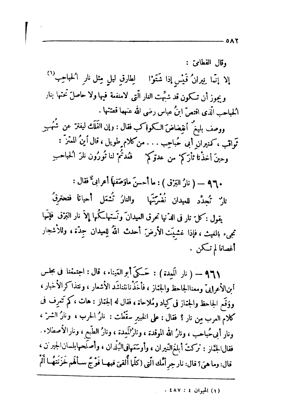 96 - (نَار الْمعدة) حكى أَبُو العيناء قَالَ اجْتَمَعنَا فى مجْلِس ابْن الأعرابى ومعنا الجاحظ والجماز فأخذنا نتناشد الْأَشْعَار ونتذاكر الْأَخْبَار وَوَقع الجاحظ والجماز فى كياد وملاحاة فَقَالَ لَهُ الجماز هَات كم تعرف فى كَلَام الْعَرَب من نَار فَقَالَ على الْخَبِير سَقَطت نَار الْحَرْب ونار الشَّرّ ونار أَبى حباحب ونار الله الموقدة ونار الْمعدة ونار الطَّبْع ونار الاصطلاء فَقَالَ الجماز تركت أبلغ النيرَان وأوسعها فى الْبلدَانِ وَأَصْلَحهَا بِلِسَان الْجِيرَان قَالَ وَمَا هى قَالَ نَار حرامك الَّتِى (كلما القى فِيهَا فَوْج سَأَلَهُمْ خزنتها ألم