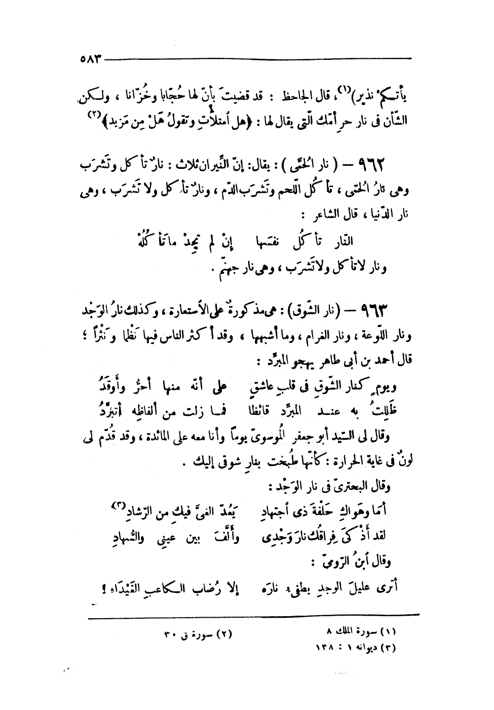 963 - (نَار الشوق) هى مَذْكُورَة على الِاسْتِعَارَة وَكَذَلِكَ نَار الوجد ونار اللوعة ونار الغرام وَمَا أشبههَا وَقد أَكثر النَّاس فِيهَا نظما ونثرا قَالَ أَحْمد بن أَبى طَاهِر يهجو الْمبرد