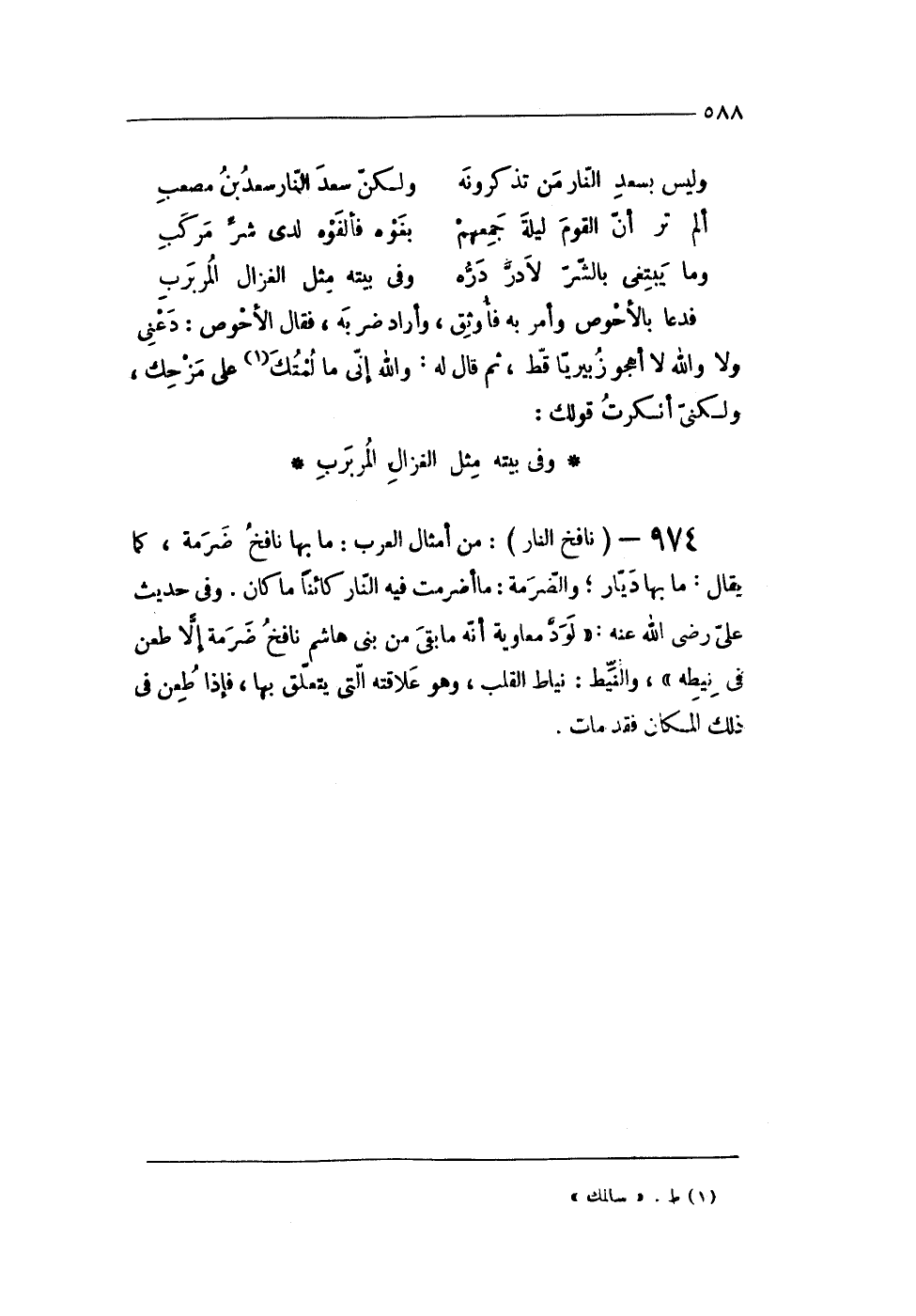 974 - (نافخ النَّار) من أَمْثَال الْعَرَب مَا بهَا نافخ ضرمة كَمَا يُقَال مَا بهَا ديار والضرمة مَا أضرمت فِيهِ النَّار كأئنا مَا كَانَ وفى حَدِيث على رضى الله عَنهُ لود مُعَاوِيَة أَنه مَا بقى من بنى هَاشم نافخ ضرمة إِلَّا طعن فى نيطه والنيط نِيَاط الْقلب وَهُوَ علاقته الَّتِى يتَعَلَّق بهَا فَإِذا طعن فى ذَلِك الْمَكَان فقد مَاتَ