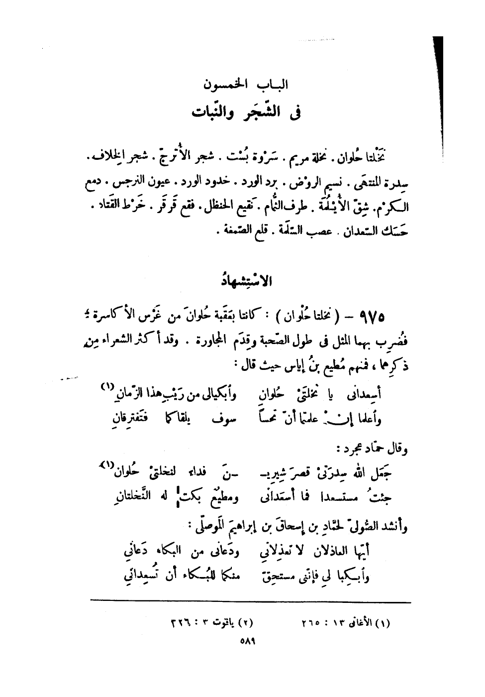 975 - (نخلتا حلوان) كَانَتَا بعقبة حلوان من غرس الأكاسرة فَضرب بهما الْمثل فى طول الصُّحْبَة وَقدم الْمُجَاورَة وَقد أَكثر الشُّعَرَاء من ذكرهمَا فَمنهمْ مُطِيع بن إِيَاس حَيْثُ قَالَ