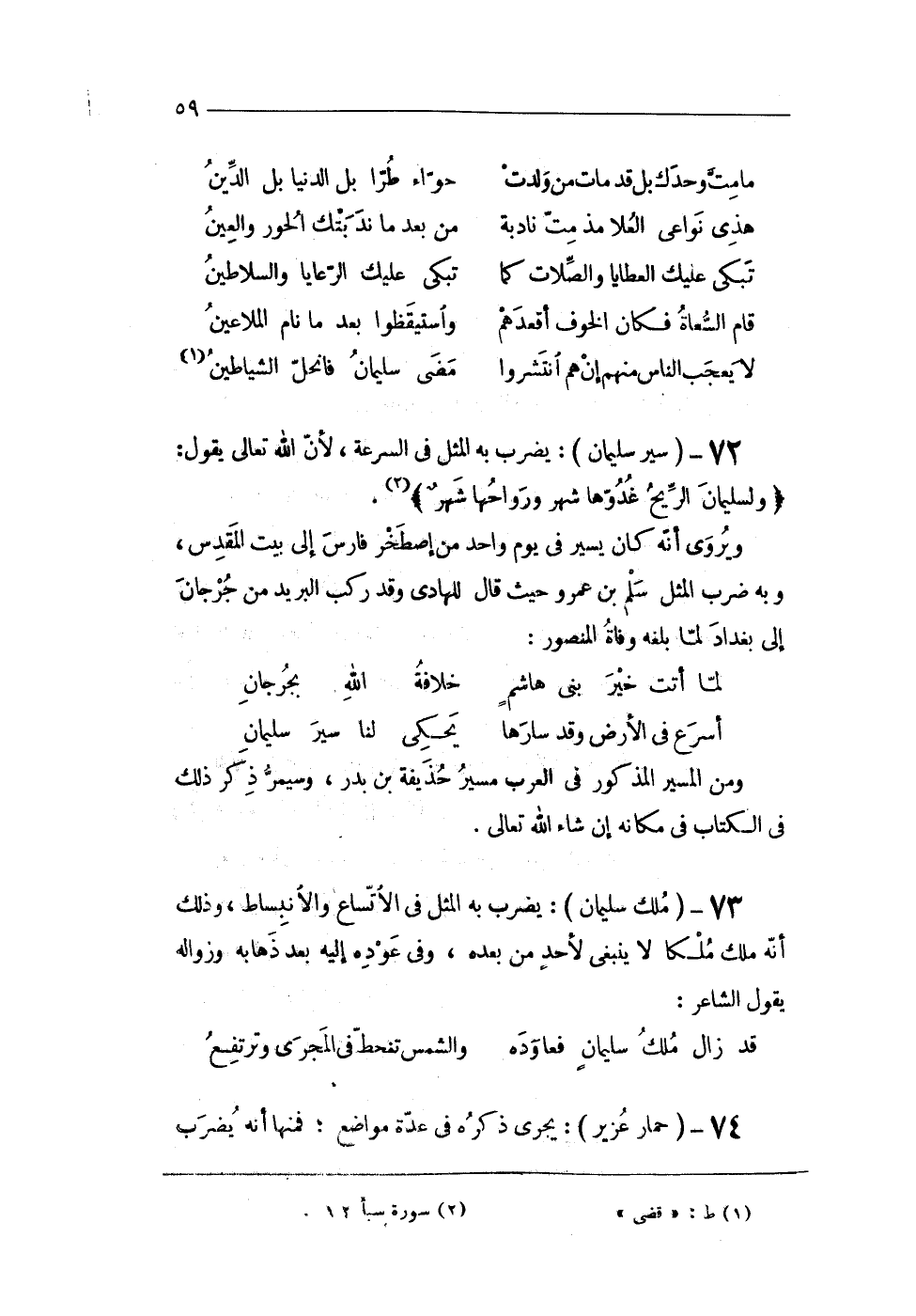 73 - (ملك سُلَيْمَان) يضْرب بِهِ الْمثل فى الاتساع والانبساط وَذَلِكَ أَنه ملك ملكا لَا ينبغى لأحد من بعده وفى عوده إِلَيْهِ بعد ذَهَابه وزواله يَقُول الشَّاعِر