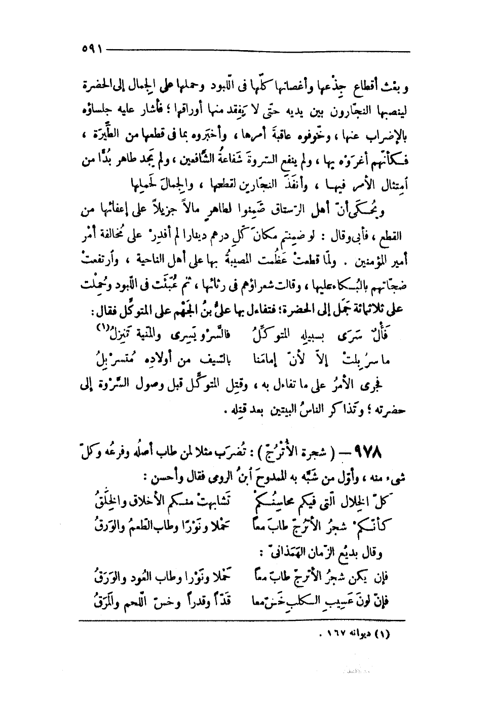 978 - (شَجَرَة الأترج) تضرب مثلا لمن طَابَ أَصله وفرعه وكل شىء مِنْهُ وَأول من شبه بِهِ الممدوح ابْن الرومى فَقَالَ وَأحسن