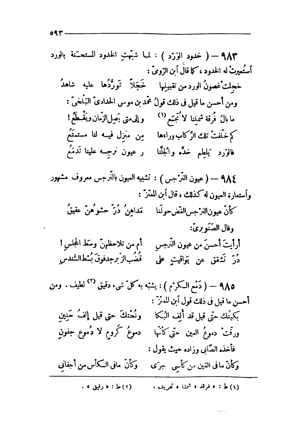 985 - (دمع الْكَرم) يشبه بِهِ كل شىء دَقِيق لطيف وَمن أحسن مَا قيل فى ذَلِك قَول ابْن المعتز