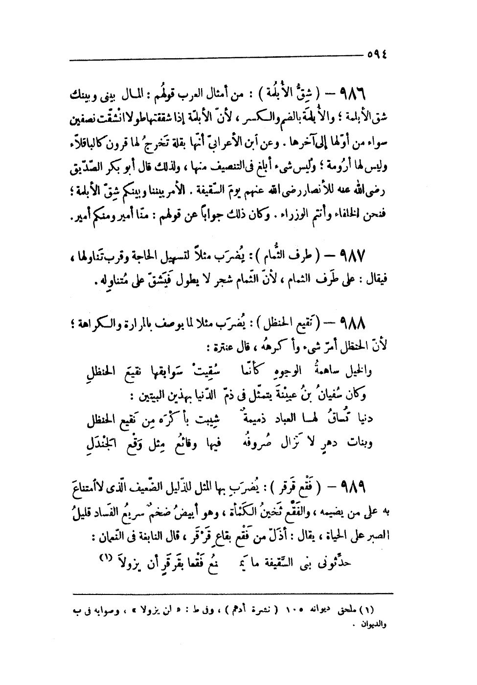 988 - (نَقِيع الحنظل) يضْرب مثلا لما يُوصف بالمرارة وَالْكَرَاهَة لِأَن الحنظل أَمر شىء وأكرهه قَالَ عنترة