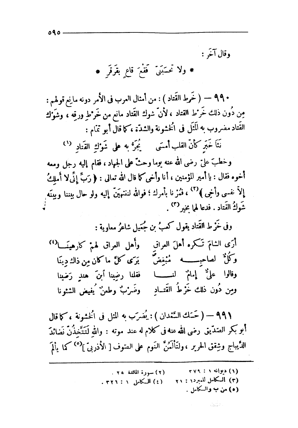 990 - (خرط القتاد) من أَمْثَال الْعَرَب فى الْأَمر دونه مَانع قَوْلهم من دون ذَلِك خرط القتاد لِأَن شوك القتاد مَانع من خرط ورقه وَشَوْك القتاد مَضْرُوب بِهِ الْمثل فى الخشونة والشدة كَمَا قَالَ أَبُو تَمام