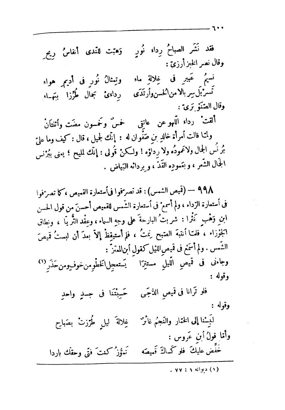 998 - (قَمِيص الشَّمْس) قد تصرفوا فى اسْتِعَارَة الْقَمِيص كَمَا تصرفوا فى اسْتِعَارَة الرِّدَاء وَلم أسمع فى اسْتِعَارَة الشَّمْس للقميص أحسن من قَول الْحسن ابْن وهب نثرا شربت البارحة على وَجه السَّمَاء وَعقد الثريا ونطاق الجوزاء فَلَمَّا انتبه الصُّبْح نمت فَلم اسْتَيْقَظَ إِلَّا بعد أَن لبست قَمِيص الشَّمْس وَلم أسمع فى قَمِيص اللَّيْل كَقَوْل ابْن المعتز