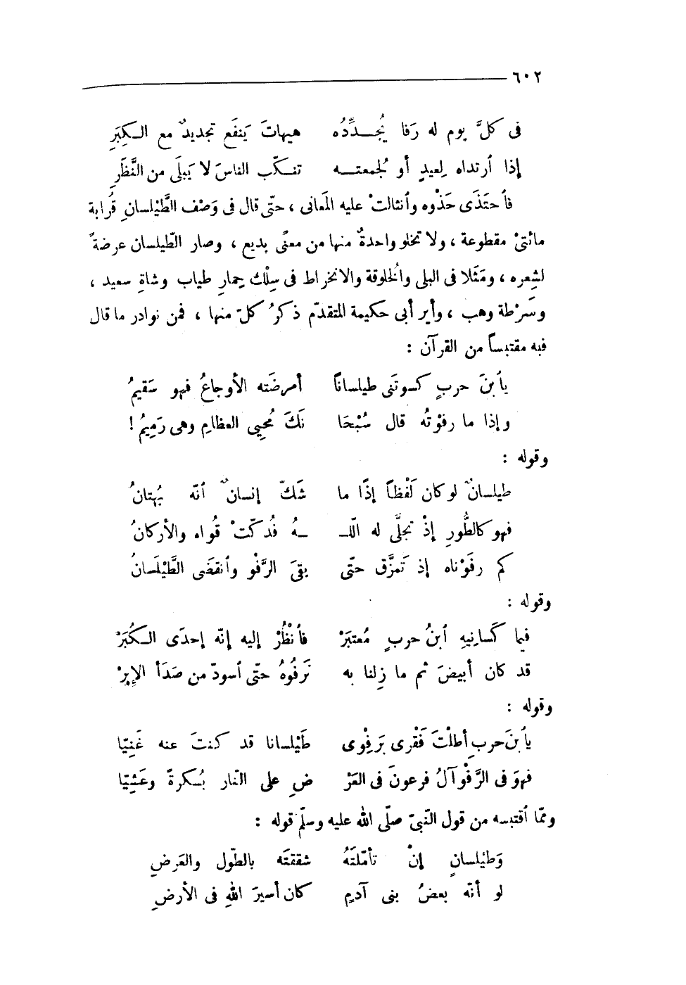 فاحتذى حذوه وانثالت عَلَيْهِ الْمعَانى حَتَّى قَالَ فى وصف الطيلسان قرَابَة مائتى مَقْطُوعَة وَلَا تَخْلُو وَاحِدَة مِنْهَا من معنى بديع وَصَارَ الطيلسان عرضه لشعره ومثلا فى البلى والخلوقة والانخراط فى سلك حمَار طياب وشَاة سعيد وسرطة وهب وأير أَبى حكيمة الْمُتَقَدّم ذكر كل مِنْهَا فَمن نَوَادِر مَا قَالَ فِيهِ مقتبسا من الْقُرْآن