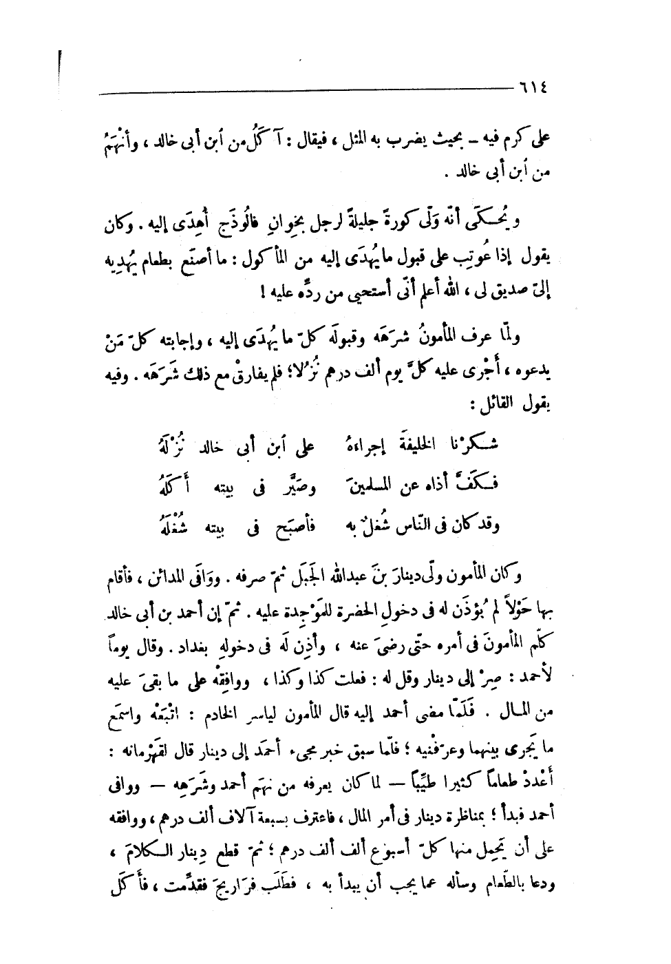 وَكَانَ الْمَأْمُون ولى دِينَار بن عبد الله الْجَبَل ثمَّ صرفه ووافى الْمَدَائِن فَأَقَامَ بهَا حولا لم يُؤذن لَهُ فى دُخُول الحضرة للموجدة عَلَيْهِ ثمَّ إِن أَحْمد بن أَبى خَالِد كلم الْمَأْمُون فى أمره حَتَّى رضى عَنهُ وَأذن لَهُ فى دُخُوله بَغْدَاد وَقَالَ يَوْمًا لِأَحْمَد صر إِلَى دِينَار وَقل لَهُ فعلت كَذَا وَكَذَا وَوَافَقَهُ على مَا بقى عَلَيْهِ من المَال فَلَمَّا مضى أَحْمد إِلَيْهِ قَالَ الْمَأْمُون لياسر الْخَادِم اتبعهُ واسمع مَا يجرى بَينهمَا وعرفنيه فَلَمَّا سبق خبر مجىء أَحْمد إِلَى دِينَار قَالَ لقهرمانه أعدد طَعَاما كثيرا طيبا لما كَانَ يعرفهُ من نهم أَحْمد وشرهه ووافى أَحْمد فَبَدَأَ بمناظرة دِينَار فى أَمر المَال فاعترف بسبعة آلَاف ألف دِرْهَم وَوَافَقَهُ على أَن يحمل مِنْهَا كل أُسْبُوع ألف ألف دِرْهَم ثمَّ قطع دِينَار الْكَلَام ودعا بِالطَّعَامِ وساله عَمَّا يجب أَن يبْدَأ بِهِ فَطلب فراريج فَقدمت فَأكل