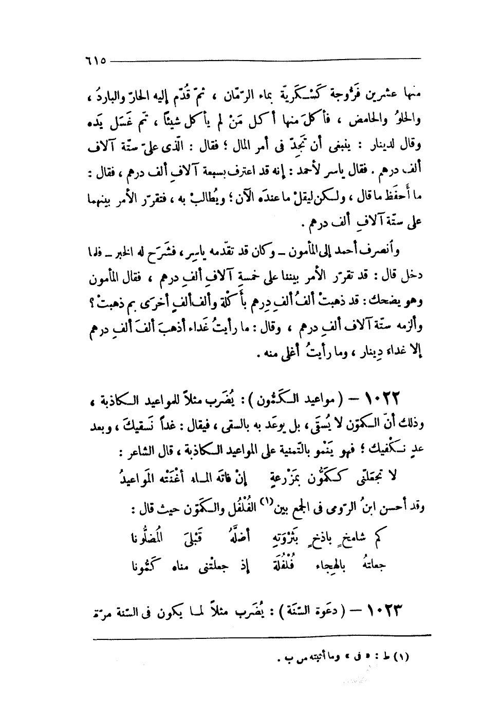 102 - (مواعيد الكمون) يضْرب مثلا للمواعيد الكاذبة وَذَلِكَ أَن الكمون لَا يسقى بل يوعد بِهِ بالسقى فَيُقَال غَدا نسقيك وَبعد عد نكفيك فَهُوَ يَنْمُو بالتمنية على المواعيد الكاذبة قَالَ الشَّاعِر
