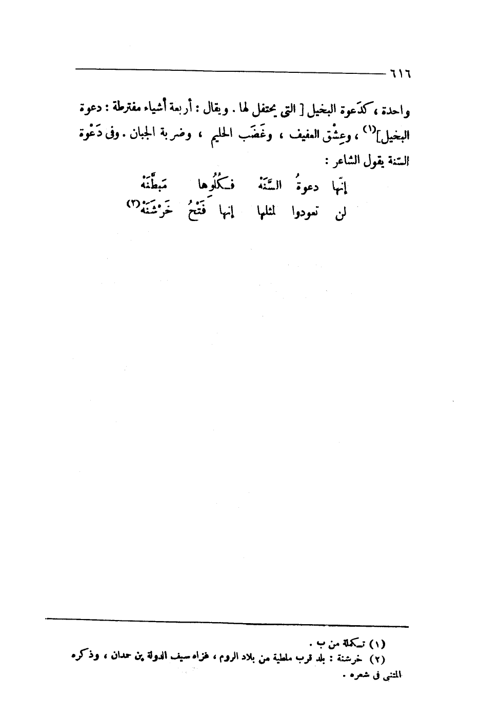وَاحِدَة كدعوة الْبَخِيل الَّتِى يحتفل لَهَا وَيُقَال أَرْبَعَة أَشْيَاء مفترطة دَعْوَة الْبَخِيل وعشق الْعَفِيف وَغَضب الْحَلِيم وضربة الجبان وفى دَعْوَة السّنة يَقُول الشَّاعِر
