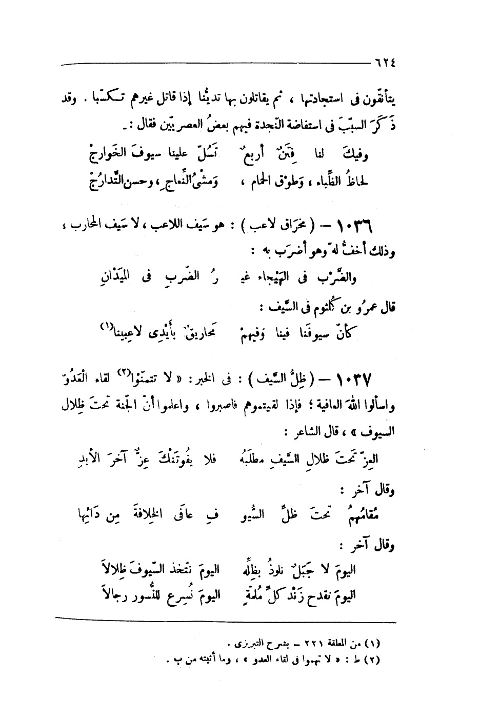 1037 - (ظلّ السَّيْف) فى الْخَبَر لَا تَتَمَنَّوْا لِقَاء الْعَدو واسألوا الله الْعَافِيَة فَإِذا لقيتموهم فَاصْبِرُوا وَاعْلَمُوا أَن الْجنَّة تَحت ظلال السيوف قَالَ الشَّاعِر