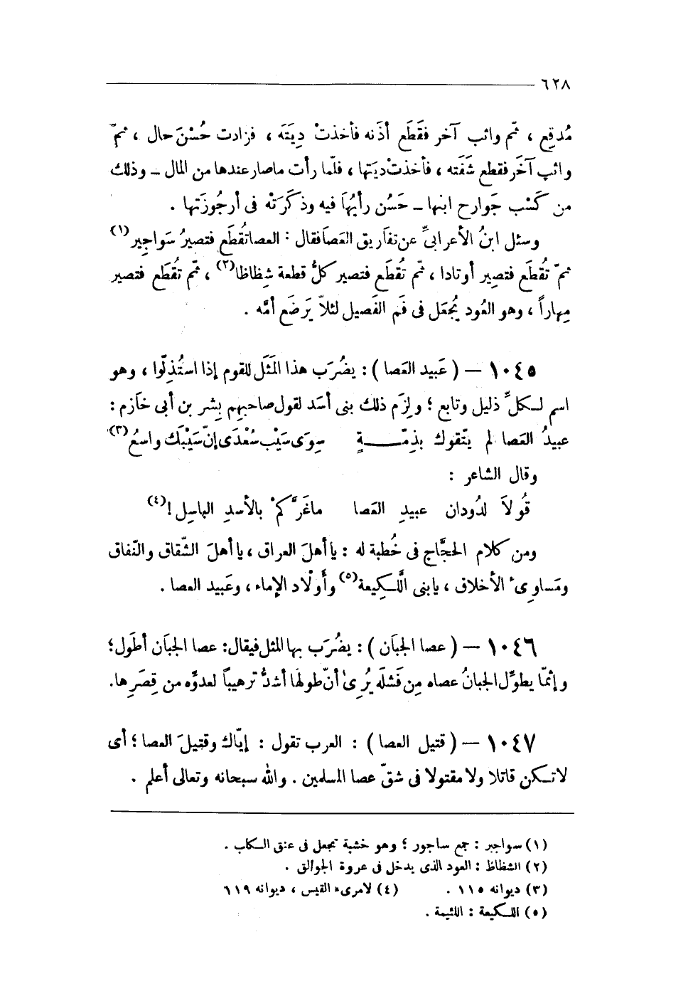 1045 - (عبيد الْعَصَا) يضْرب هَذَا الْمثل للْقَوْم إِذا استذلوا وَهُوَ اسْم لكل ذليل وتابع وَلزِمَ ذَلِك بنى أَسد لقَوْل صَاحبهمْ بشر بن أَبى خازم