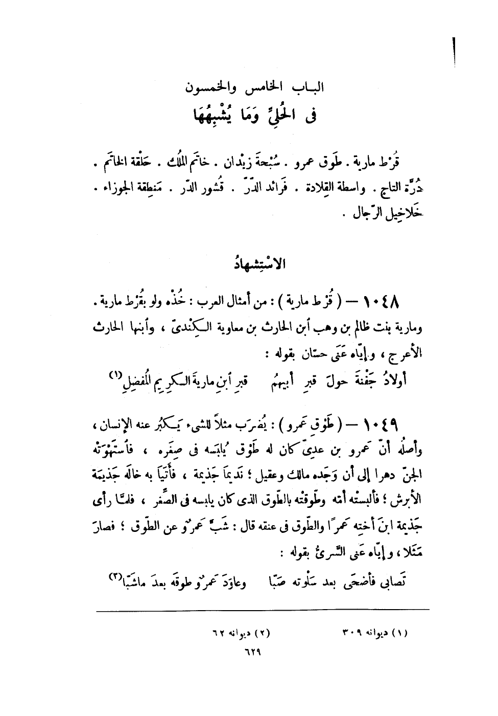 1049 - (طوق عَمْرو) يضْرب مثلا للشىء يكبر عَنهُ الْإِنْسَان وَأَصله أَن عَمْرو بن عدى كَانَ لَهُ طوق يلْبسهُ فى صغره فاستهوته الْجِنّ دهرا إِلَى أَن وجده مَالك وَعقيل نديما جذيمة فَأتيَا بِهِ خَاله جذيمة الأبرش فألبسته أمه وطوقته بالطوق الذى كَانَ يلْبسهُ فى الصغر فَلَمَّا رأى جذيمة ابْن أُخْته عمرا والطوق فى عُنُقه قَالَ شب عَمْرو عَن الطوق فَصَارَ مثلا وإياه عَنى السرى بقوله