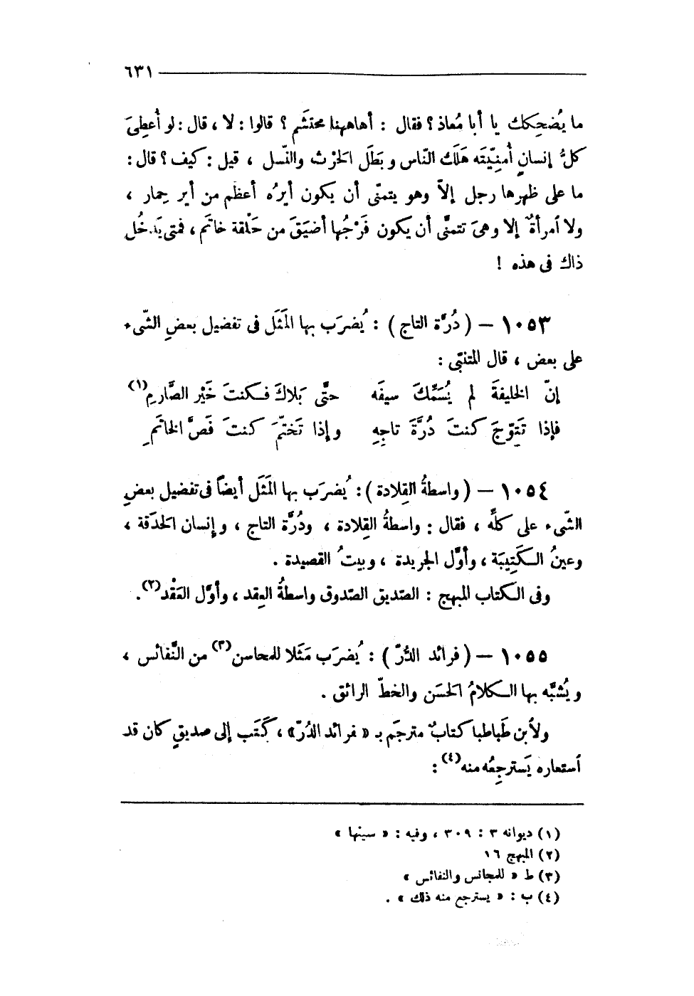1053 - (درة التَّاج) يضْرب بهَا الْمثل فى تَفْضِيل بعض الشىء على بعض قَالَ المتنبى
