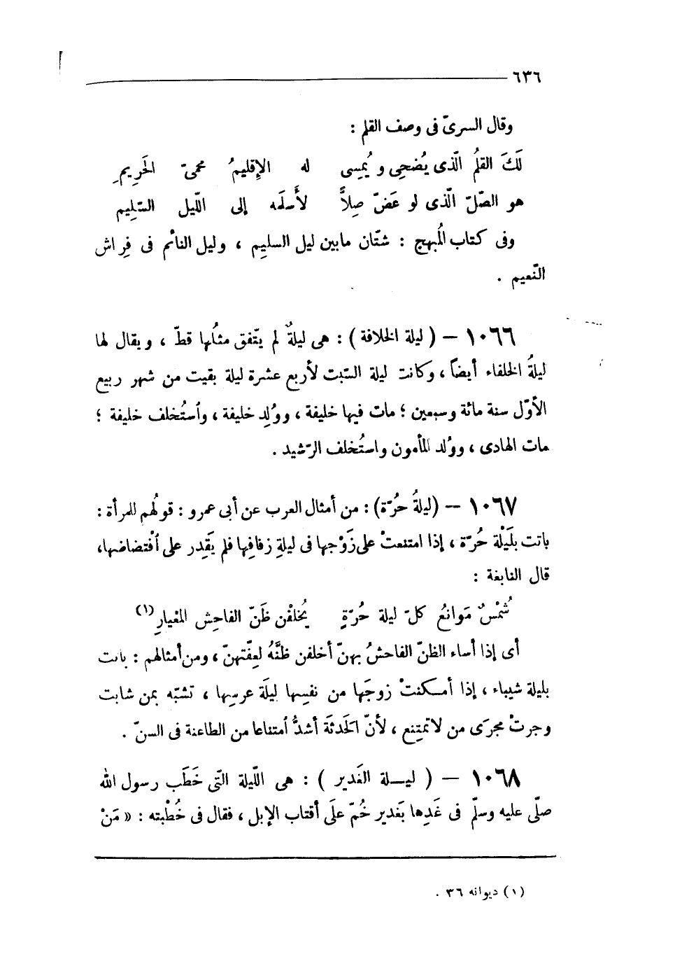 1068 - (لَيْلَة الغدير) هى اللَّيْلَة الَّتِى خطب رَسُول الله صلى الله عَلَيْهِ وَسلم فى غدها بغدير خم على أقتاب الْإِبِل فَقَالَ فى خطبَته (من