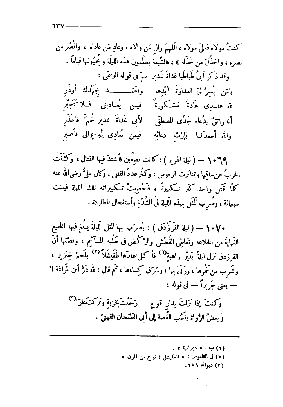 1069 - (لَيْلَة الهرير) كَانَت بصفين فَاشْتَدَّ فِيهَا الْقِتَال وكشفت الْحَرْب عَن سَاقهَا وتناثرت الرُّءُوس وَكثر عدد الْقَتْلَى وَكَانَ على رضى الله عَنهُ كلما قتل وَاحِدًا كبر تَكْبِيرَة فأحصيت تكبيراته تِلْكَ اللَّيْلَة فبلغت سَبْعمِائة وَضرب الْمثل بِهَذِهِ اللَّيْلَة فى الشدَّة واستفحال المطاردة