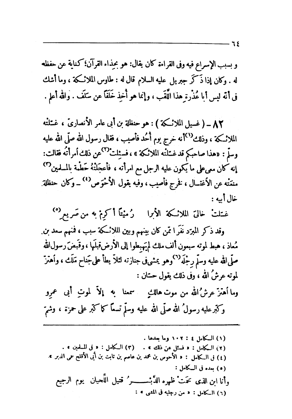 8 - (غسيل الْمَلَائِكَة) هُوَ حَنْظَلَة بن أَبى عَامر الأنصارى غسلته الْمَلَائِكَة وَذَلِكَ أَنه خرج يَوْم أحد فأصيب فَقَالَ رَسُول الله صلى الله عَلَيْهِ وَسلم (هَذَا صَاحبكُم قد غسلته الْمَلَائِكَة) فَسُئِلت عَن ذَلِك امْرَأَته فَقَالَت إِنَّه كَانَ معى على مَا يكون عَلَيْهِ الرجل مَعَ امْرَأَته فأعجلته حطمة بِالْمُسْلِمين منعته عَن الِاغْتِسَال فَخرج فأصيب وَفِيه يَقُول الْأَحْوَص وَكَانَ حَنْظَلَة خَال أَبِيه