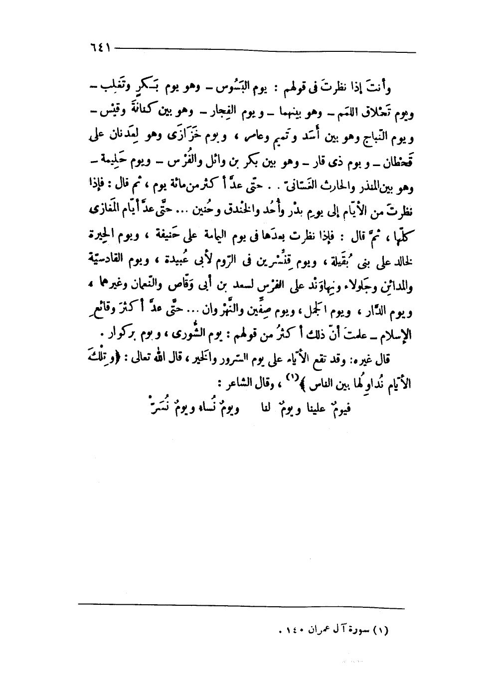 وَأَنت إِذا نظرت فى قَوْلهم يَوْم البسوس وَهُوَ يَوْم بكر وتغلب وَيَوْم تحلاق اللمم وَهُوَ بَينهمَا وَيَوْم الْفجار وَهُوَ بَين كنَانَة وَقيس وَيَوْم النباج وَهُوَ بَين أَسد وَتَمِيم وعامر وَيَوْم خزازى وَهُوَ لعدنان على قحطان وَيَوْم ذى قار وَهُوَ بَين بكر بن وَائِل وَالْفرس وَيَوْم حليمة وَهُوَ بَين الْمُنْذر والْحَارث الغسانى حَتَّى عد أَكثر من مائَة يَوْم ثمَّ قَالَ فَإِذا نظرت من الْأَيَّام إِلَى يَوْم بدر وَأحد وَالْخَنْدَق وحنين حَتَّى عد أَيَّام المغازى كلهَا ثمَّ قَالَ فَإِذا نظرت بعْدهَا فى يَوْم الْيَمَامَة على حنيفَة وَيَوْم الْحيرَة لخَالِد على بنى بقيلة وَيَوْم قنسرين فى الرّوم لأبى عُبَيْدَة وَيَوْم الْقَادِسِيَّة والمدائن وجلولاء ونهاوند على الْفرس لسعد بن أَبى وَقاص والنعمان وَغَيرهمَا وَيَوْم الدَّار وَيَوْم الْجمل وَيَوْم صفّين والنهروان حَتَّى عد أَكثر وقائع الْإِسْلَام علمت أَن ذَلِك أَكثر من قَوْلهم يَوْم الشورى وَيَوْم بركوار