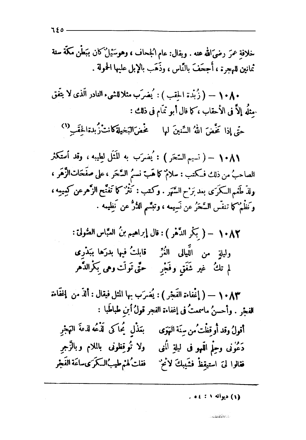 1080 - (زبدة الحقب) يضْرب مثلا للشىء النَّادِر الذى لَا يتَّفق مثله إِلَّا فى الأحقاب كَمَا قَالَ ابو تَمام فى ذَلِك