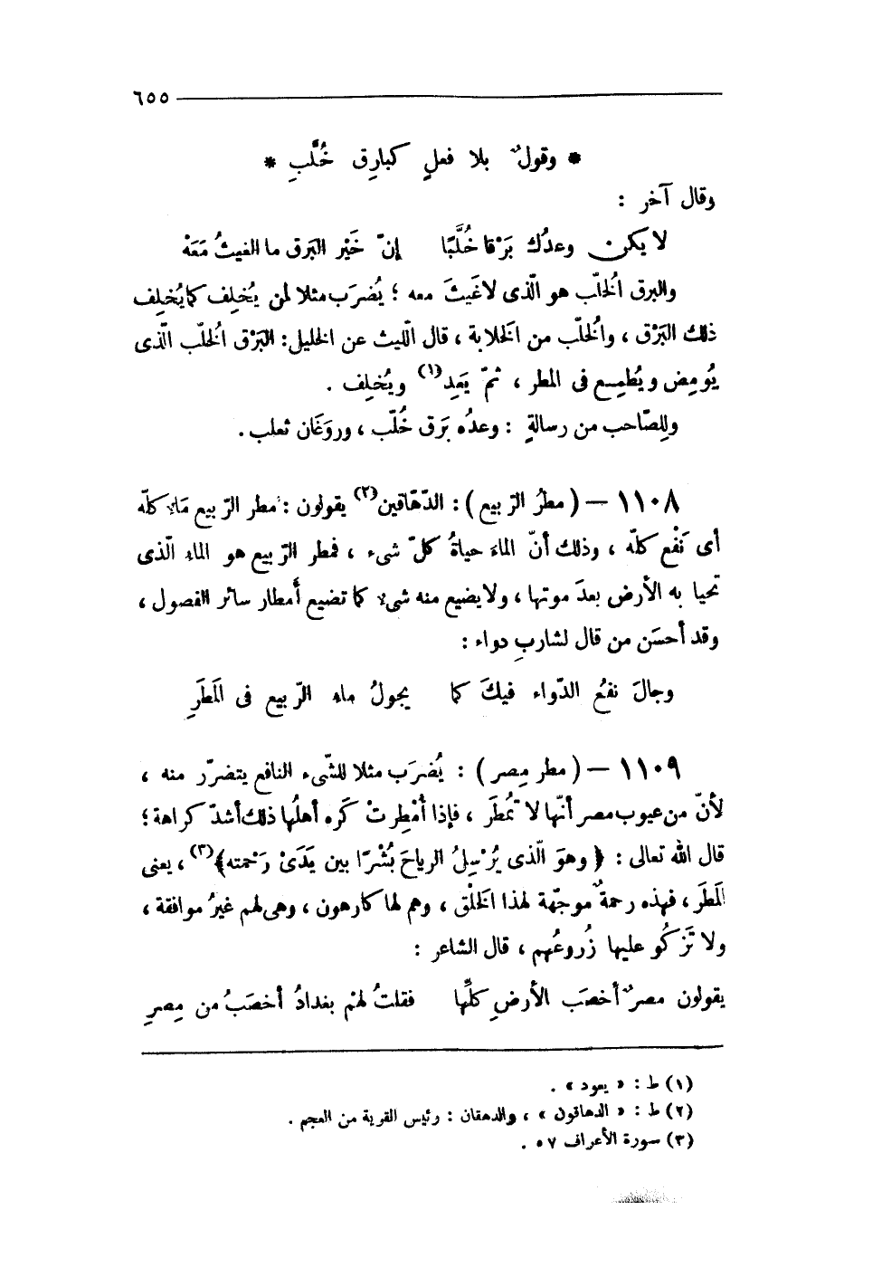 1108 - (مطر الرّبيع) الدهاقين يَقُولُونَ مطر الرّبيع مَاء كُله أى نفع كُله وَذَلِكَ أَن المَاء حَيَاة كل شىء فمطر الرّبيع هُوَ المَاء الذى تحيا بِهِ الأَرْض بعد مَوتهَا وَلَا يضيع مِنْهُ شىء كَمَا تضيع أمطار سَائِر الْفُصُول وَقد أحسن من قَالَ لشارب دَوَاء