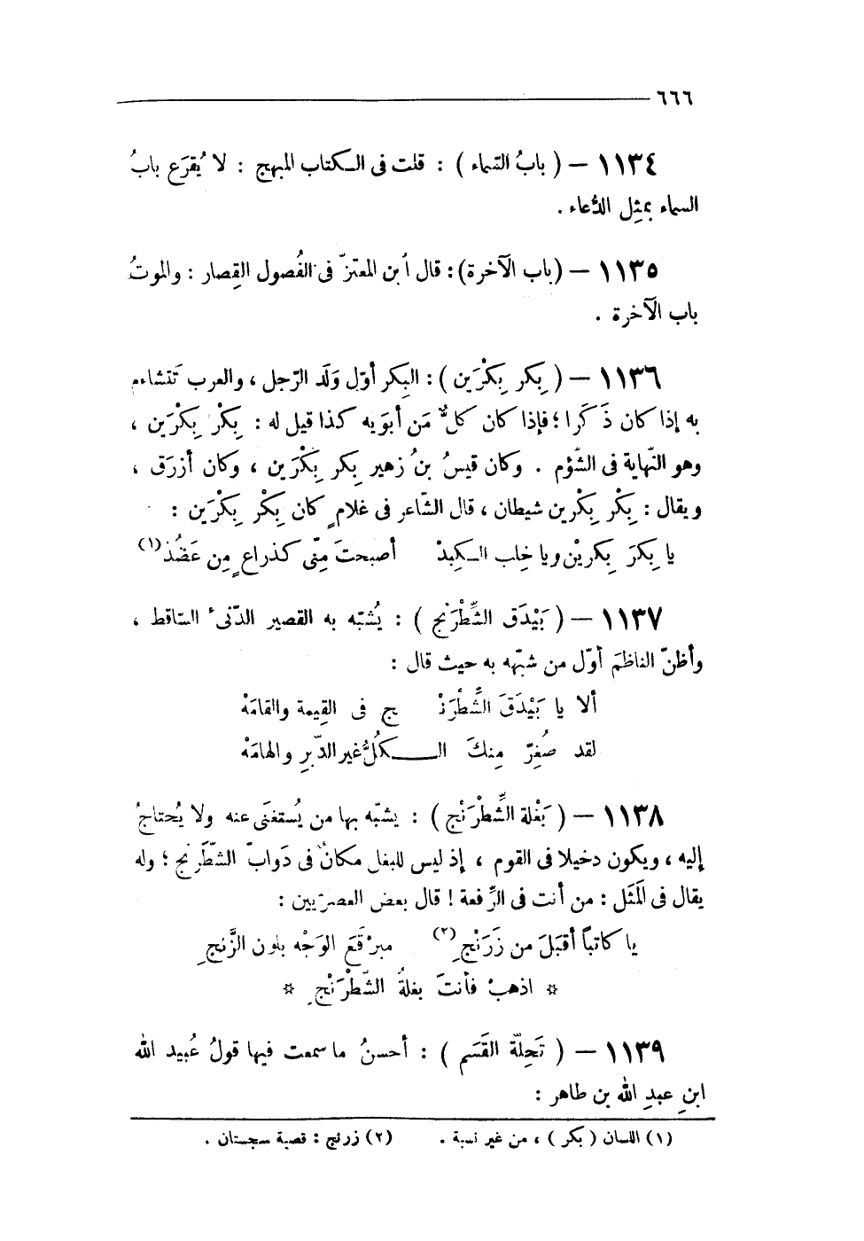 1136 - (بكر بكرين) الْبكر الأول ولد الرجل وَالْعرب تتشاءم بِهِ إِذا كَانَ ذكرا فَإِذا كَانَ كل من أَبَوَيْهِ كَذَا قيل لَهُ بكر بكرين وَهُوَ النِّهَايَة فى الشؤم وَكَانَ قيس بن زُهَيْر بكر بكرين وَكَانَ أَزْرَق وَيُقَال بكر بكرين شَيْطَان قَالَ الشَّاعِر فى غُلَام كَانَ بكر بكرين