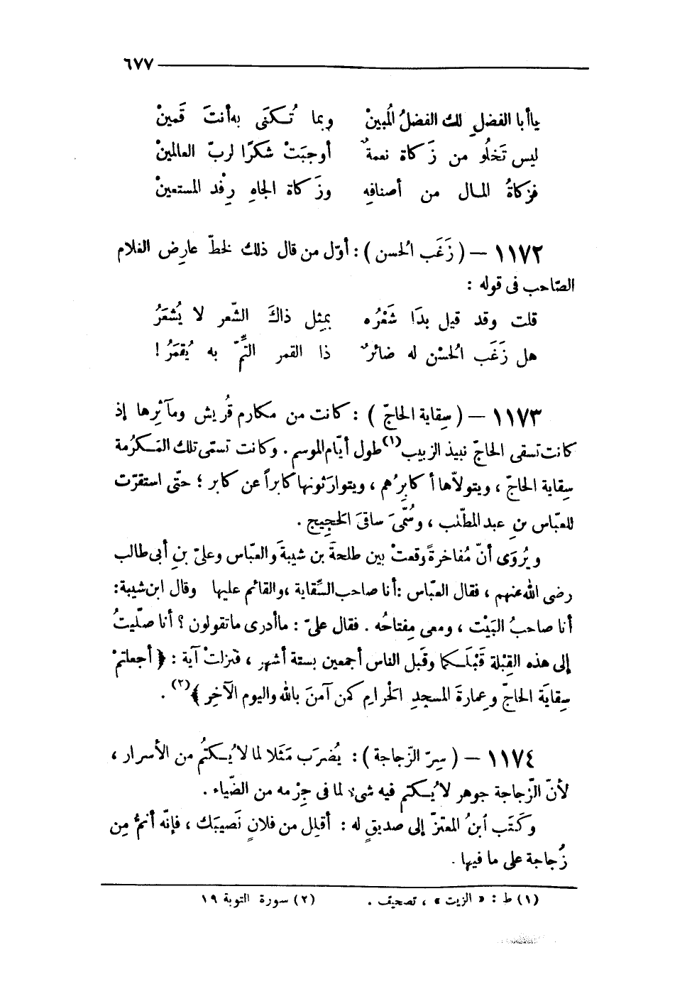 1173 - (سِقَايَة الْحَاج) كَانَت من مَكَارِم قُرَيْش ومآثرها إِذْ كَانَت تسقى الْحَاج نَبِيذ الزَّبِيب طول أَيَّام الْمَوْسِم وَكَانَت تسمى تِلْكَ المكرمة سِقَايَة الْحَاج ويتولاها أكابرهم ويتوارثونها كَابِرًا عَن كَابر حَتَّى اسْتَقَرَّتْ للْعَبَّاس بن عبد الْمطلب وسمى ساقى الحجيج