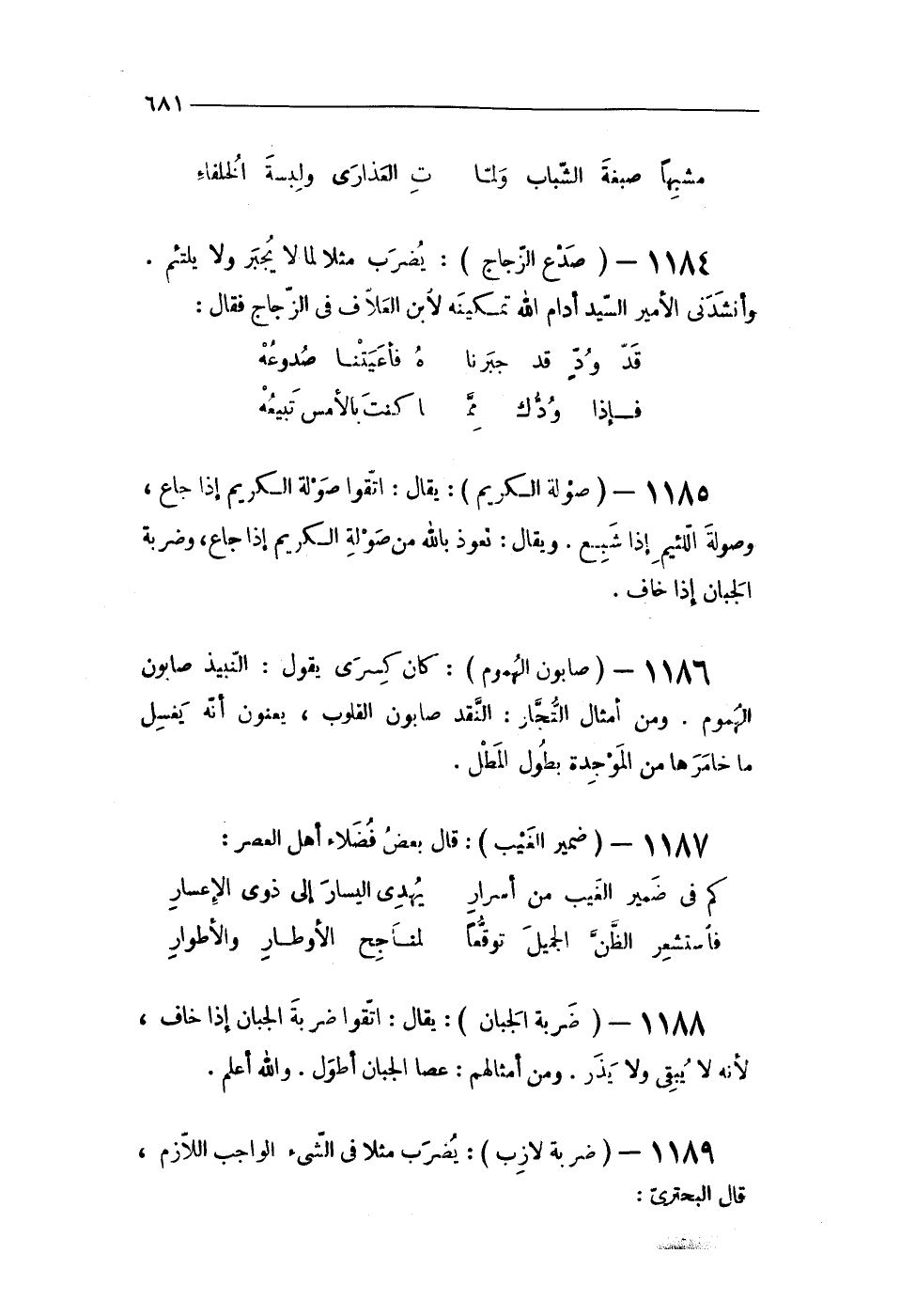 1184 - (صدع الزّجاج) يضْرب مثلا لما لَا يجْبر وَلَا يلتئم وأنشدنى الْأَمِير السَّيِّد أدام الله تَمْكِينه لِابْنِ العلاف فى الزّجاج فَقَالَ