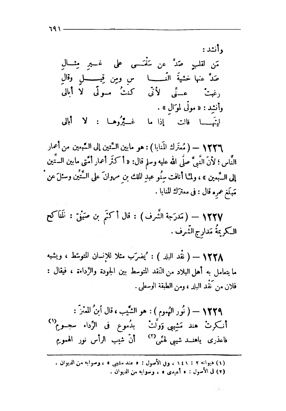 1226 - (معترك المنايا) هُوَ مَا بَين السِّتين إِلَى السّبْعين من أَعمار النَّاس لِأَن النبى صلى الله عَلَيْهِ وَسلم قَالَ (أَكْثرُوا أَعمار أمتى مَا بَين السِّتين إِلَى السّبْعين) \ ح \ وَلما أنافت سنو عبد الْملك بن مَرْوَان على السِّتين وَسُئِلَ عَن مبلغ عمره قَالَ فى معترك المنايا