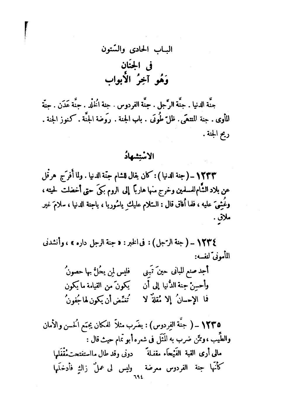 1235 - (جنَّة الفردوس) يضْرب مثلا للمكان يجمع الْحسن والأمان وَالطّيب وَمِمَّنْ ضرب بِهِ الْمثل فى شعره أَبُو تَمام يث قَالَ