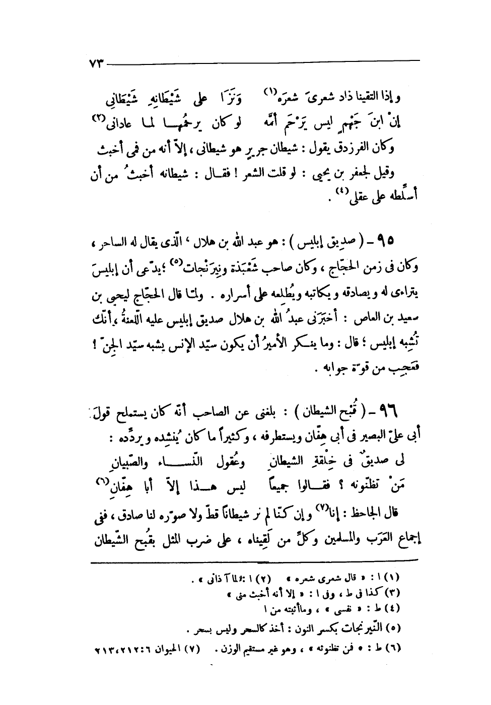 95 - (صديق إِبْلِيس) هُوَ عبد الله بن هِلَال الذى يُقَال لَهُ السَّاحر وَكَانَ فى زمن الْحجَّاج وَكَانَ صَاحب شعبذة ونيرنجات يدعى أَن إِبْلِيس يتَرَاءَى لَهُ ويصادقه ويكاتبه ويطلعه على أسراره وَلما قَالَ الْحجَّاج ليحيى بن سعيد بن الْعَاصِ أخبرنى عبد الله بن هِلَال صديق إِبْلِيس عَلَيْهِ اللَّعْنَة أَنَّك تشبه إِبْلِيس قَالَ وَمَا يُنكر الْأَمِير أَن يكون سيد الْإِنْس يشبه سيد الْجِنّ فَعجب من قُوَّة جَوَابه