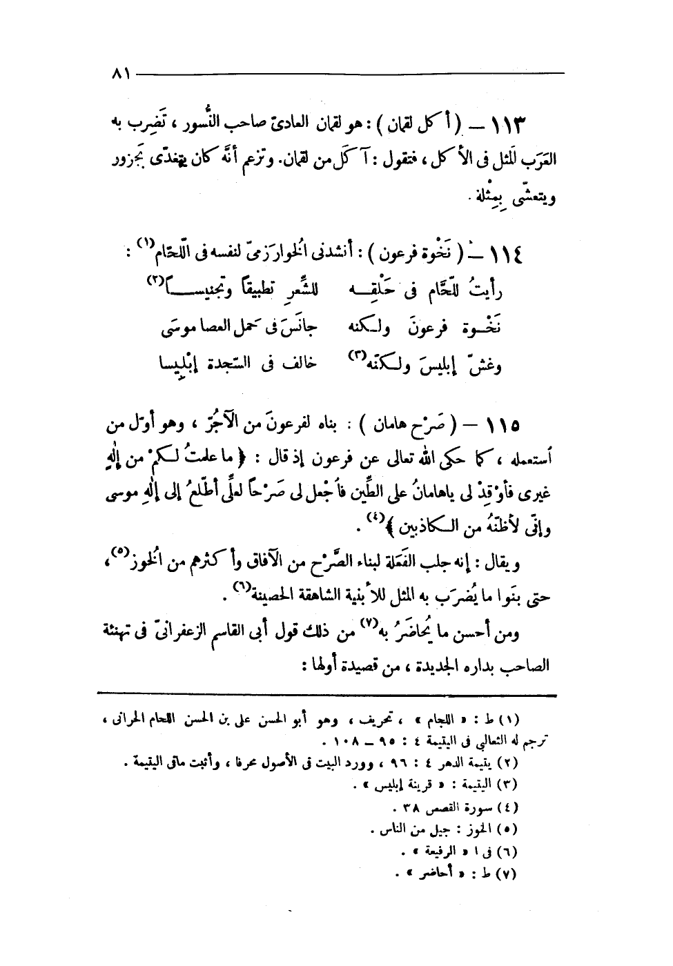 113 - (أكل لُقْمَان) هُوَ لُقْمَان العادى صَاحب النسور تضرب بِهِ الْعَرَب الْمثل فى الْأكل فَنَقُول آكل من لُقْمَان وتزعم أَنه كَانَ يتغدى بجزور ويتعشى بِمثلِهِ