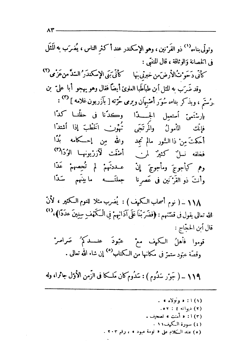 118 - (نوم أَصْحَاب الْكَهْف) يضْرب مثلا للنوم الْكثير لِأَن الله تَعَالَى يَقُول فى قصتهم {فضربنا على آذانهم فِي الْكَهْف سِنِين عددا} قَالَ ابْن الْحجَّاج