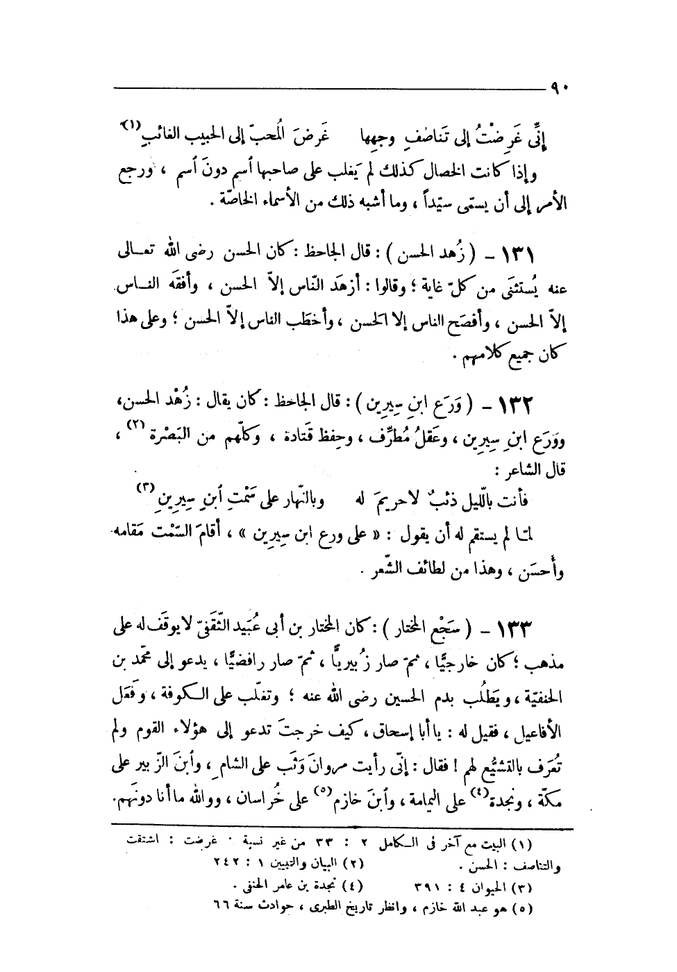 13 - (ورع ابْن سِيرِين) قَالَ الجاحظ كَانَ يُقَال زهد الْحسن وورع ابْن سِيرِين وعقل مطرف وَحفظ قَتَادَة وَكلهمْ من الْبَصْرَة قَالَ الشَّاعِر
