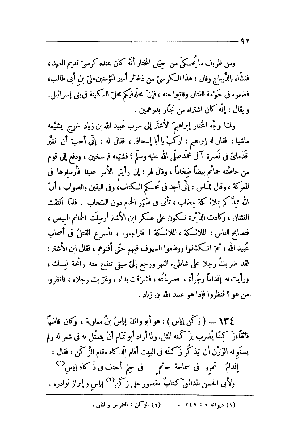 134 - (زكن إِيَاس) هُوَ أَبُو وَاثِلَة إِيَاس بن مُعَاوِيَة وَكَانَ قَاضِيا فائقا زكنا يضْرب بزكنه الْمثل وَلما أَرَادَ ابو تَمام أَن يتَمَثَّل بِهِ فى شعر لَهُ وَلم يستوله الْوَزْن أَن يذكر زكنه فى الْبَيْت أَقَامَ الذكاء مقَام الزكن فَقَالَ