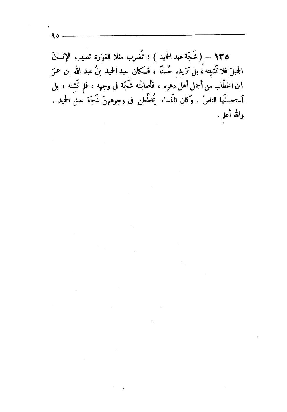 135 - (شجة عبد الحميد) تضرب مثلا للعورة تصيب الْإِنْسَان الْجَمِيل فَلَا تشينه بل تزيده حسنا فَكَانَ عبد الحميد بن عبد الله بن عمر ابْن الْخطاب من أجمل أهل دهره فاصابته شجة فى وَجهه فَلم تشنه بل استحسنها النَّاس وَكَانَ النِّسَاء يخططن فى وجوههن شجة عبد الحميد وَالله أعلم