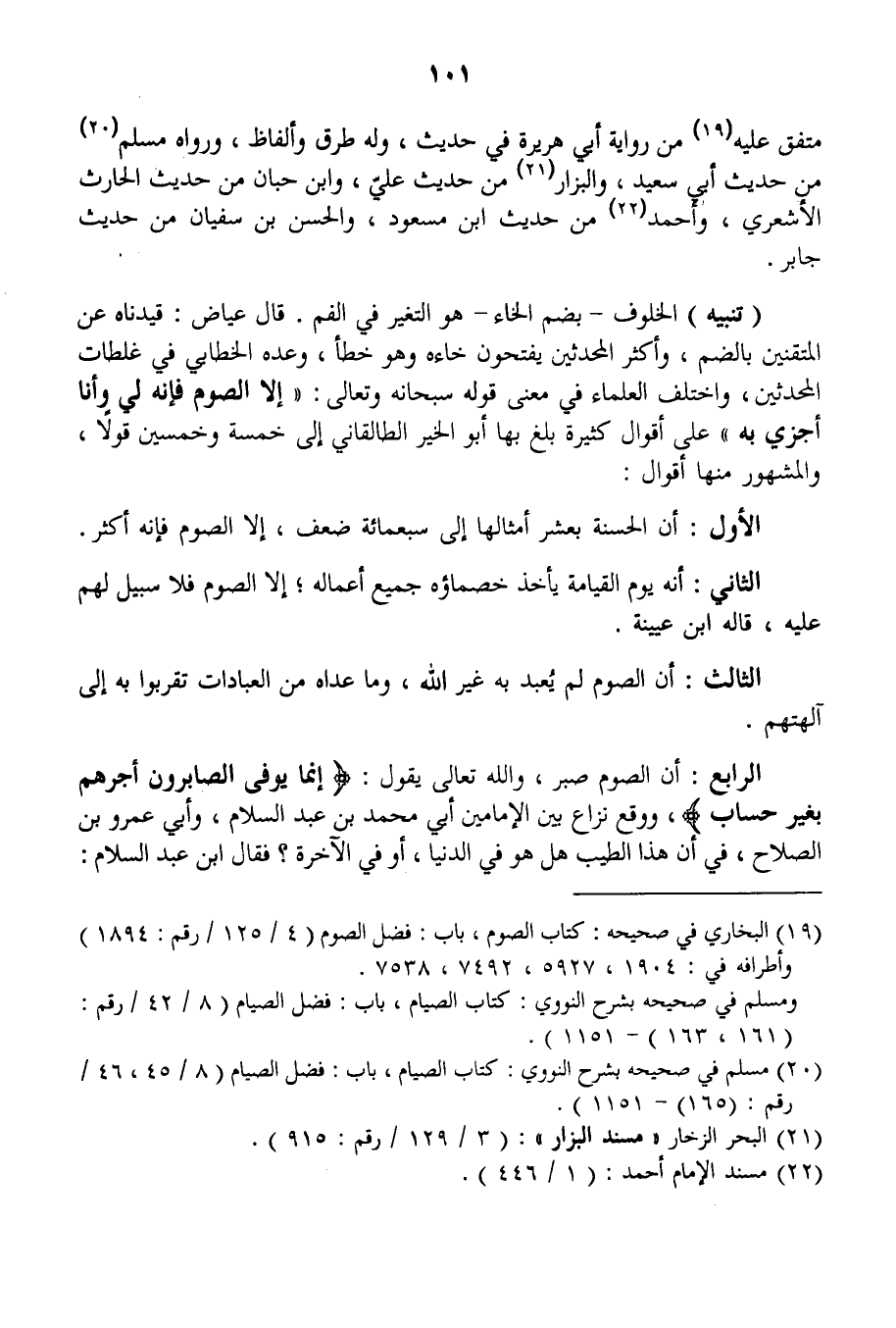 الرَّابِعُ: أَنَّ الصَّوْمَ صَبْرٌ، وَاَللَّهُ تَعَالَى يَقُولُ: {إِنَّمَا يُوَفَّى الصَّابِرُونَ أَجْرَهُمْ بِغَيْرِ حِسَابٍ} [الزمر: 10] ، وَوَقَعَ نِزَاعٌ بَيْن الْإِمَامَيْنِ أَبِي مُحَمَّدِ بْنِ عَبْدِ السَّلَامِ، وَأَبِي عَمْرِو بْنِ الصَّلَاحِ، فِي أَنَّ هَذَا الطِّيبَ هَلْ هُوَ فِي الدُّنْيَا، أَوْ فِي الْآخِرَةِ؟ فَقَالَ ابْنُ عَبْدِ السِّلَامِ: