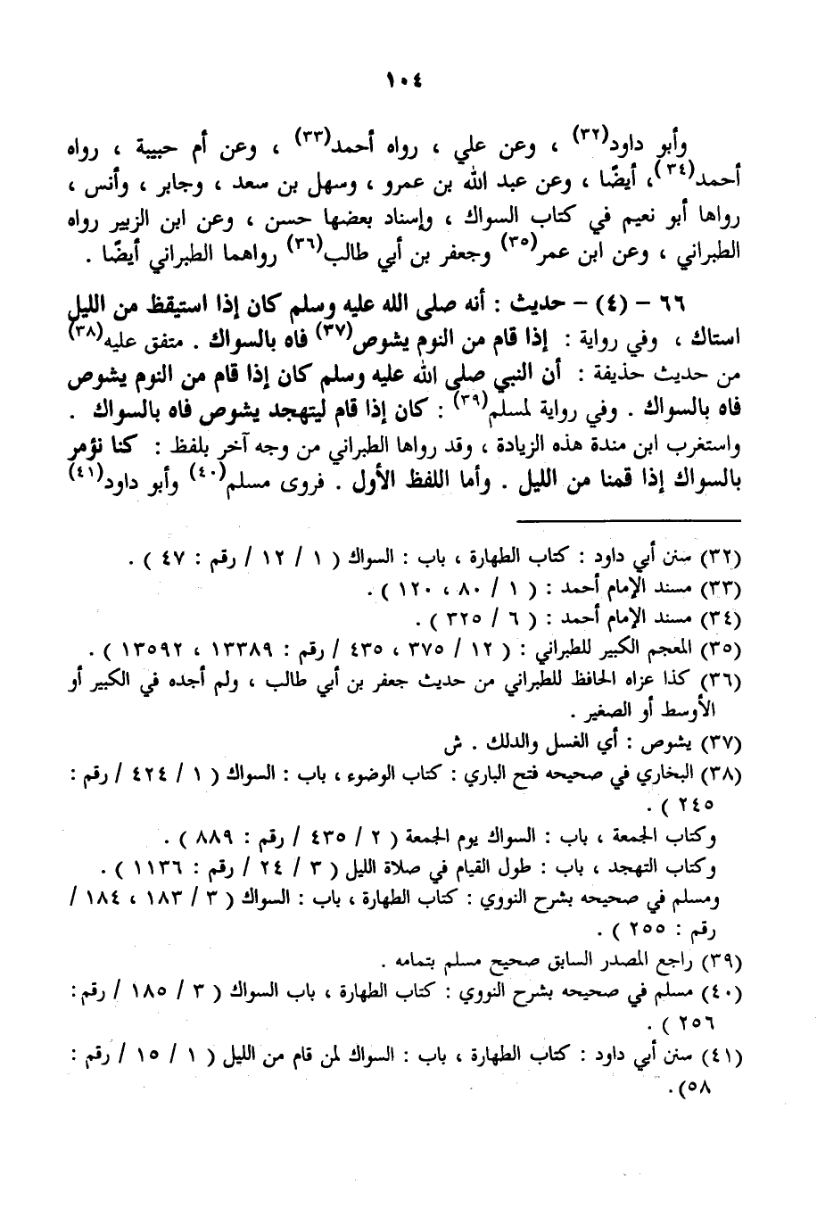 66 - (4) - حَدِيثُ: «أَنَّهُ - صَلَّى اللَّهُ عَلَيْهِ وَسَلَّمَ - كَانَ إذَا اسْتَيْقَظَ مِنْ اللَّيْلِ اسْتَاكَ» ، وَفِي رِوَايَةٍ: «إذَا قَامَ مِنْ النَّوْمِ يَشُوصُ فَاهُ بِالسِّوَاكِ» . مُتَّفَقٌ عَلَيْهِ مِنْ حَدِيثِ حُذَيْفَةَ: «أَنَّ النَّبِيَّ - صَلَّى اللَّهُ عَلَيْهِ وَسَلَّمَ - كَانَ إذَا قَامَ مِنْ النَّوْمِ يَشُوصُ فَاهُ بِالسِّوَاكِ» . وَفِي رِوَايَةٍ لِمُسْلِمٍ: «كَانَ إذَا قَامَ لِيَتَهَجَّدَ يَشُوصُ فَاهُ بِالسِّوَاكِ» . وَاسْتَغْرَبَ ابْنُ مَنْدَهْ هَذِهِ الزِّيَادَةَ، وَقَدْ رَوَاهَا الطَّبَرَانِيُّ مِنْ وَجْهٍ آخَرَ بِلَفْظِ: «كُنَّا نُؤْمَرُ بِالسِّوَاكِ إذَا قُمْنَا مِنْ اللَّيْلِ» . وَأَمَّا اللَّفْظُ الْأَوَّلُ. فَرَوَى مُسْلِمٌ وَأَبُو دَاوُد
