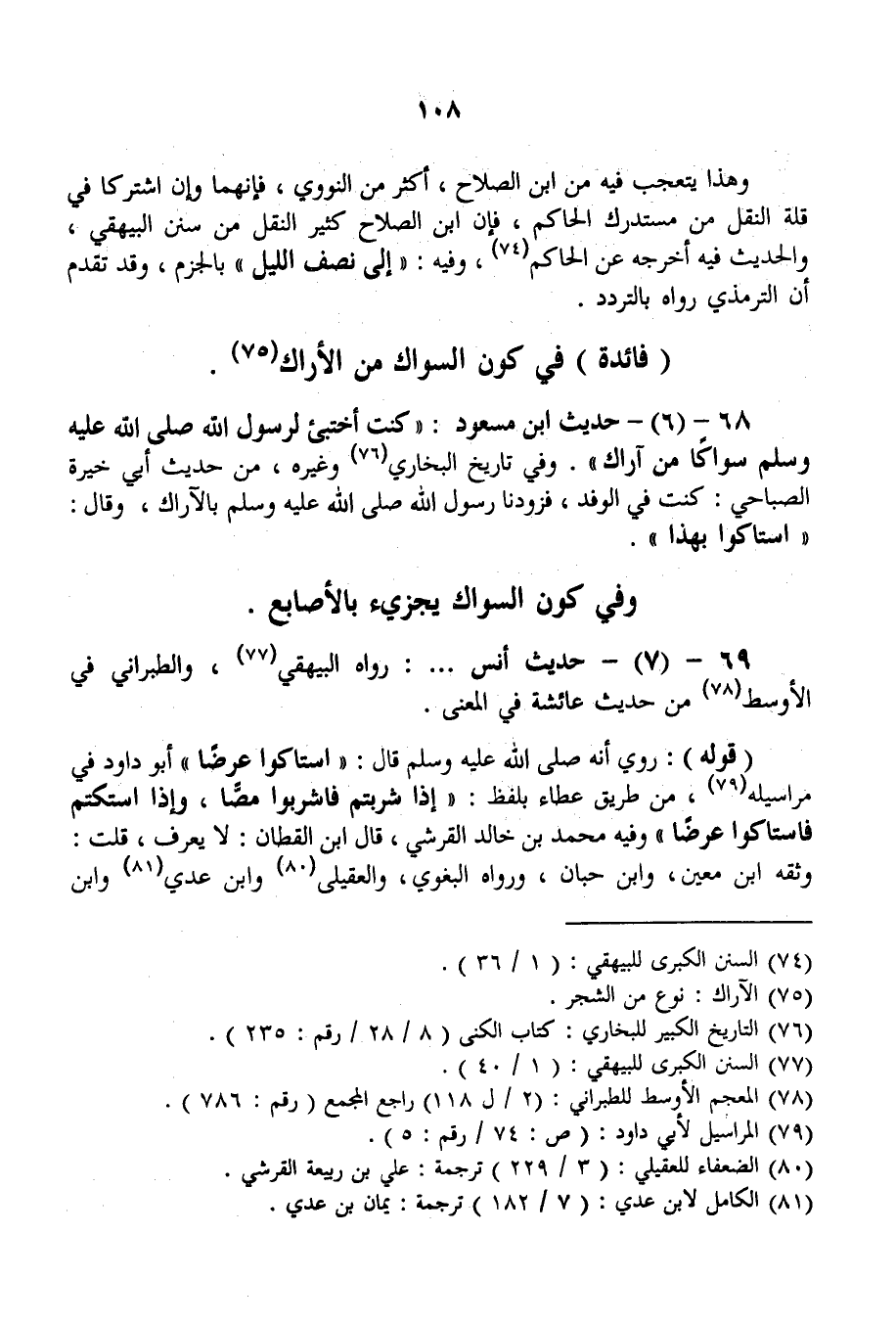 68 - (6) - حَدِيثُ ابْنِ مَسْعُودٍ: «كُنْت أَخْتَبِئُ لِرَسُولِ اللَّهِ - صَلَّى اللَّهُ عَلَيْهِ وَسَلَّمَ - سِوَاكًا مِنْ أَرَاكٍ» . وَفِي تَارِيخِ الْبُخَارِيِّ وَغَيْرِهِ، مِنْ حَدِيثِ أَبِي خَيْرَةَ الصُّبَاحِيِّ: «كُنْتُ فِي الْوَفْدِ، فَزَوَّدَنَا رَسُولُ اللَّهِ - صَلَّى اللَّهُ عَلَيْهِ وَسَلَّمَ - بِالْأَرَاكِ، وَقَالَ: اسْتَاكُوا بِهَذَا» .